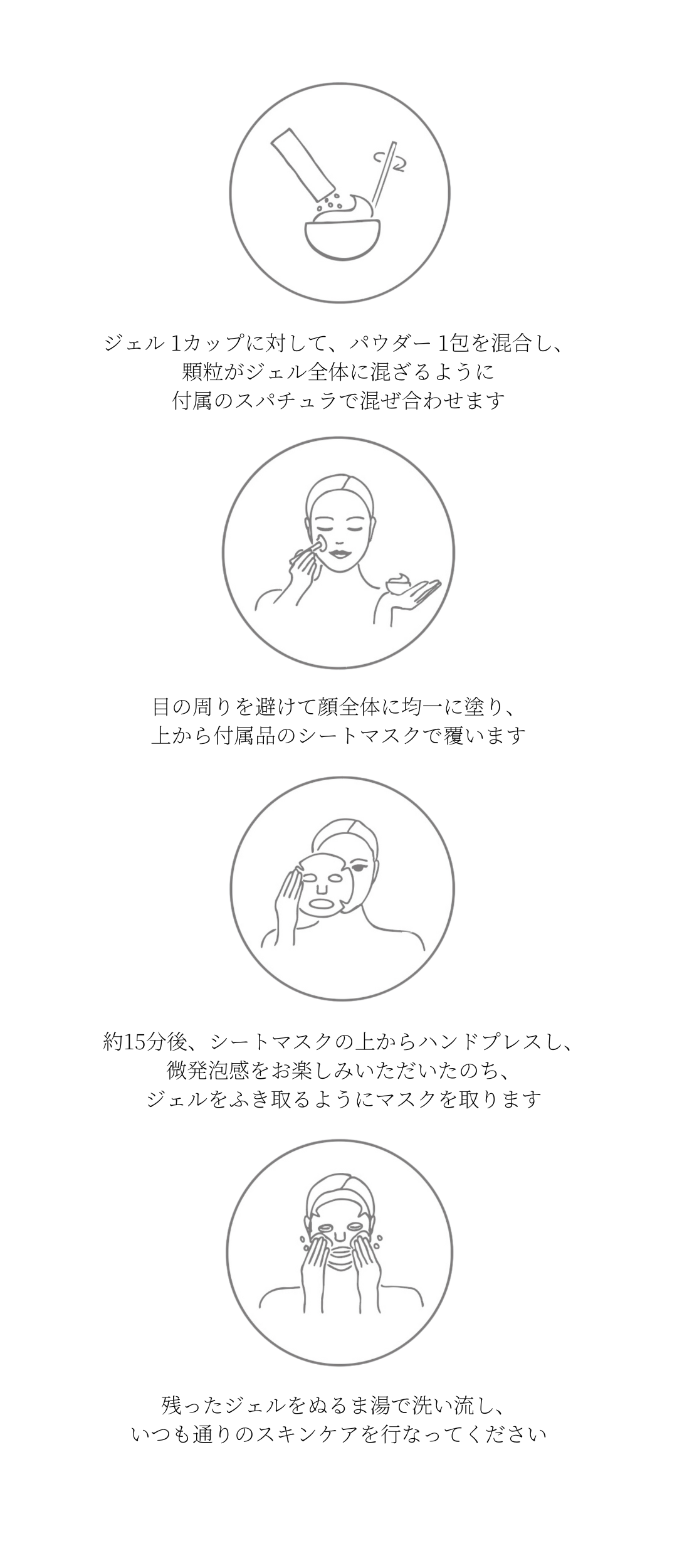 15分の使用で約40万ppm*1の水素ガスが発生。特殊製法の元に叶ったハイクオリティなジェルマスク。CICA(ツボクサエキス)*2・バクチオール*3ナイアシンアミド*3・ヒアルロン酸*3などを厳選配合し、内側から潤い満ちる艶肌に。