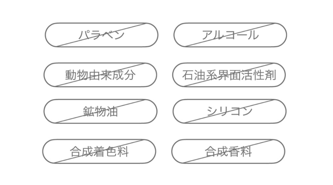 パラベン・アルコール・鉱物油・シリコン・動物由来成分・石油系界面活性剤・合成着色料・合成香料はすべて不使用。動物実験も行わない、安全で優しい製品作りにこだわっています。