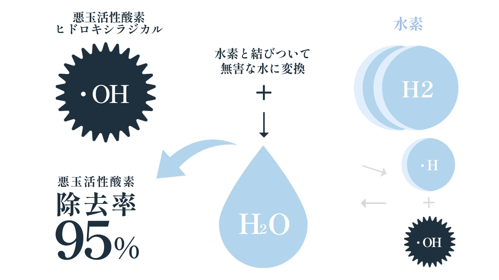 シミ・シワ・たるみ・にきびなど、肌トラブルの根本原因となる活性酸素。その中でも最凶と言われ、細胞を酸化(サビ)させるヒドロキシラジカルを、水に変換し、約95%*2も除去*3させます。